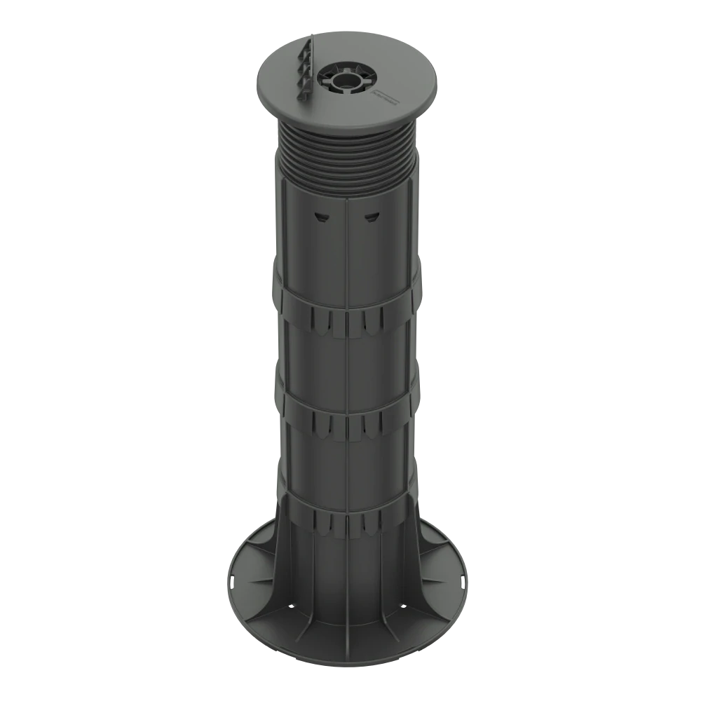 Rektifikační terč pod terasová prkna se samonivelační hlavou H 430–530 mm je výškově nastavitelné řešení určené pro suchou montáž dřevěných nebo WPC terasových prken na rošt. Tento model se skládá ze základního terče H 130–230 mm a tří prodloužení, která umožňují nastavit celkovou výšku od 430 mm do 530 mm. Samonivelační hlava automaticky vyrovnává sklon podkladu až do cca 5 %, což usnadňuje instalaci roštu a zajišťuje rovný, stabilní a nosný povrch i při nerovném podkladu.